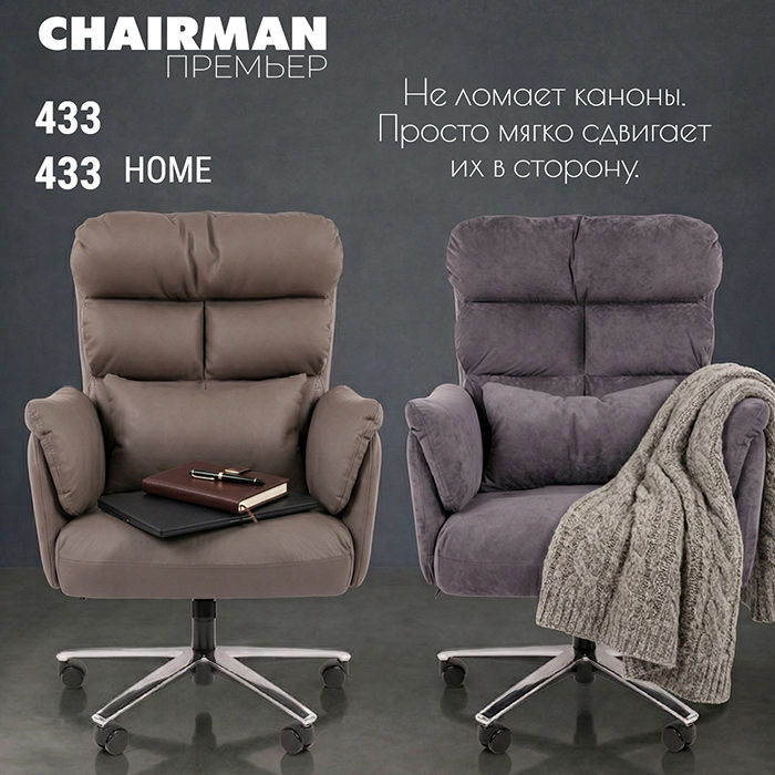 Наша сегодняшняя новинка (или новинки? кресло – одно, модификаций – две: CHAIRMAN 433 и CHAIRMAN 433 HOME) – это ни в коем случае не компромисс цены и уровня продукта. Это – кресло высочайшего уровня, а действительно доступная для небанального, «штучного» кресла цена – всего лишь дополнительная «вишенка на торте».